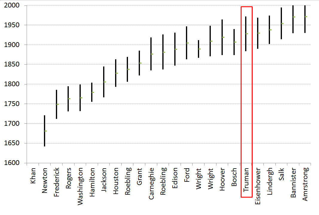 Truman (his lifespan highlighted in red) has a significant number of accomplishments, even when compared to an illustrious set of peers.