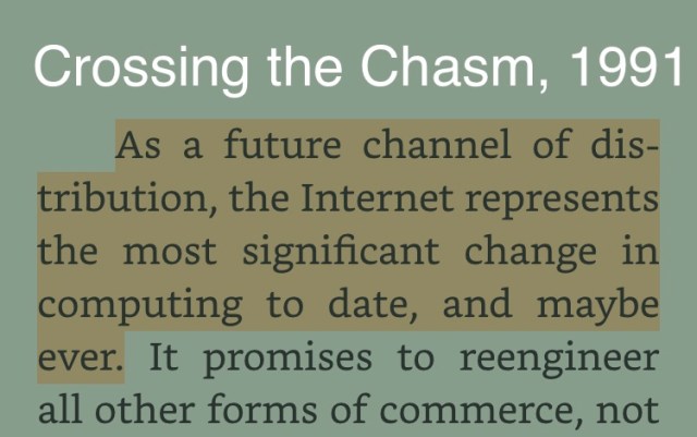 “The purpose of the post chasm enterprise is to make money.” Chapter 8, Location 2978