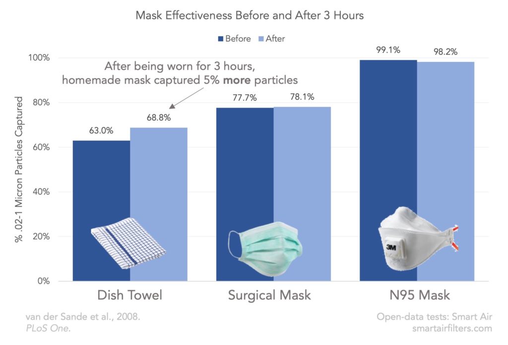 Masks work worse after washing. Don’t wear a wet mask! Masks depend on charge to work. Find ways to add back charge.