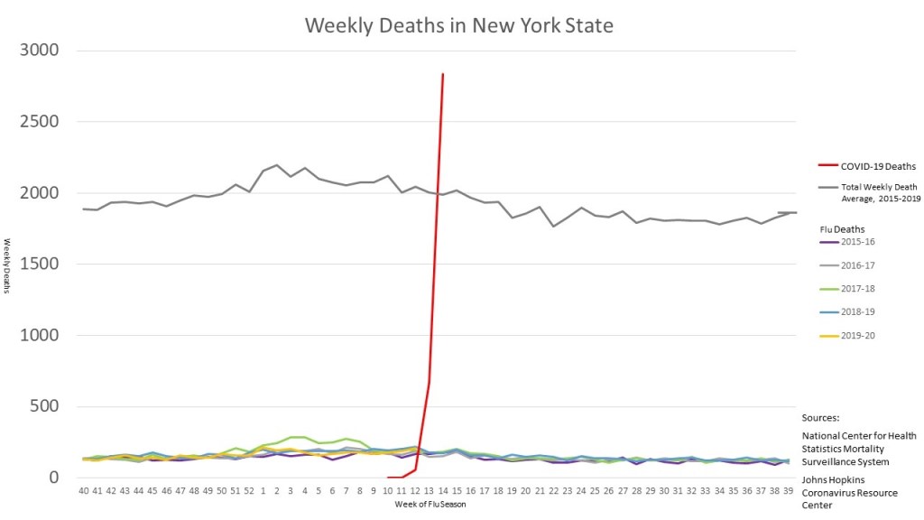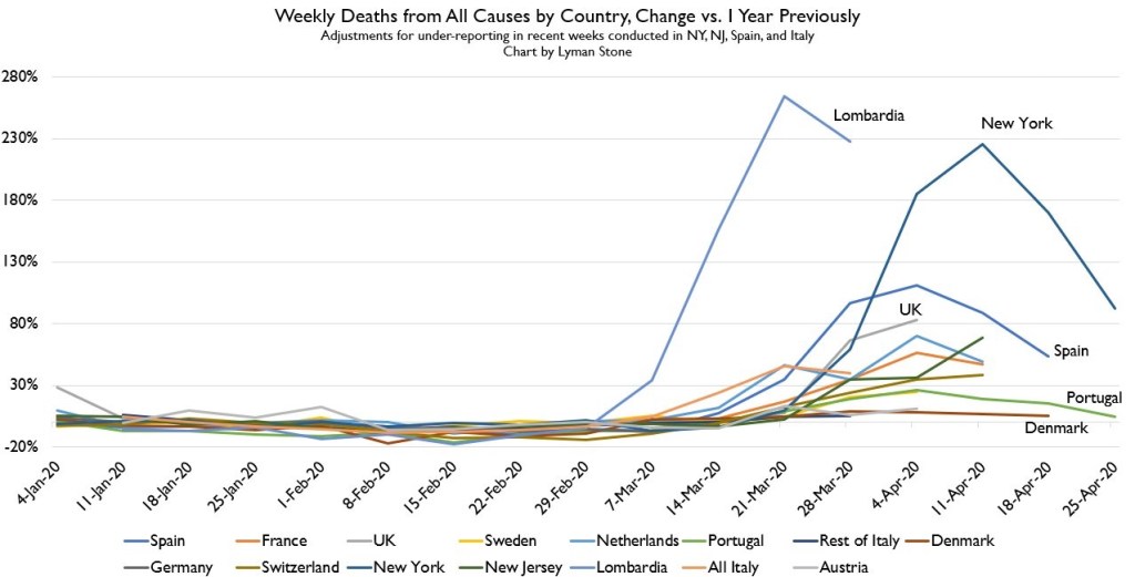 650,000 Italians died in 2019. 2,839,205 Americans died in the same year. If the citizens of both countries are sheltering-in-place, avoiding risks and less likely to die from other cuases – then any rise in ‘all-cause’ fatalities should be due to Covid-19.