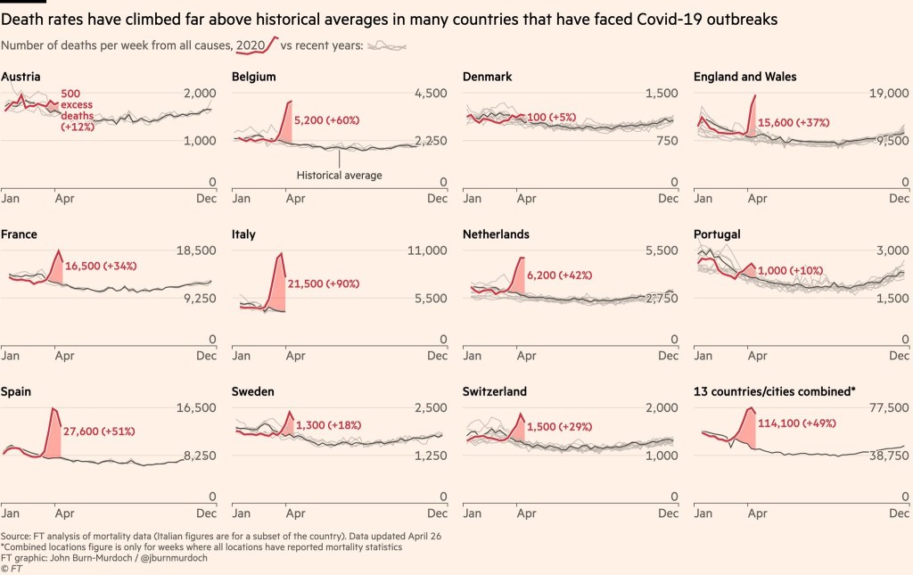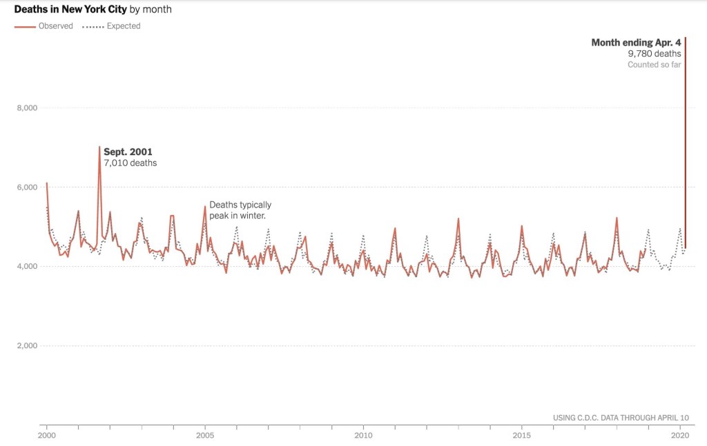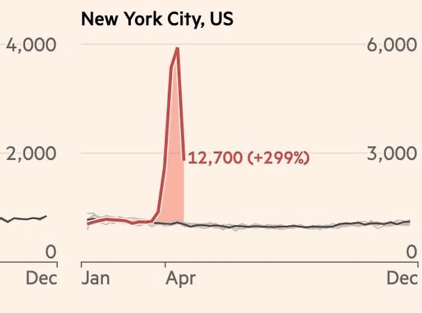 All cause mortality tracks how many people have died due to any cause – and that shows that something is happening in the population. The spike in New York City deaths has surpassed 9/11. As the charts below from the Financial Times and other sources show, several regions show a surge in all-cause mortality.
