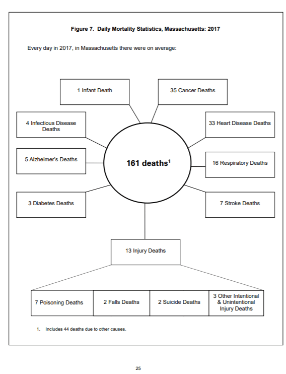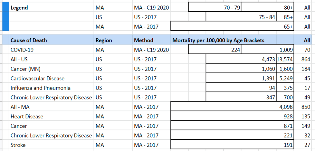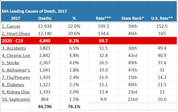 Massachusetts most recent posting with thorough analysis of causes of death in the state – the ‘2017 Death Report’ can be found in the states Death Data. If the 2020 year-to-date C19 data is used as a benchmark in the 2017 data – then C19 would be the third leading cause of death, behind only cancer (149.3 deaths per 100,000 people) and heart disease (134.7 deaths per 100,000 people).