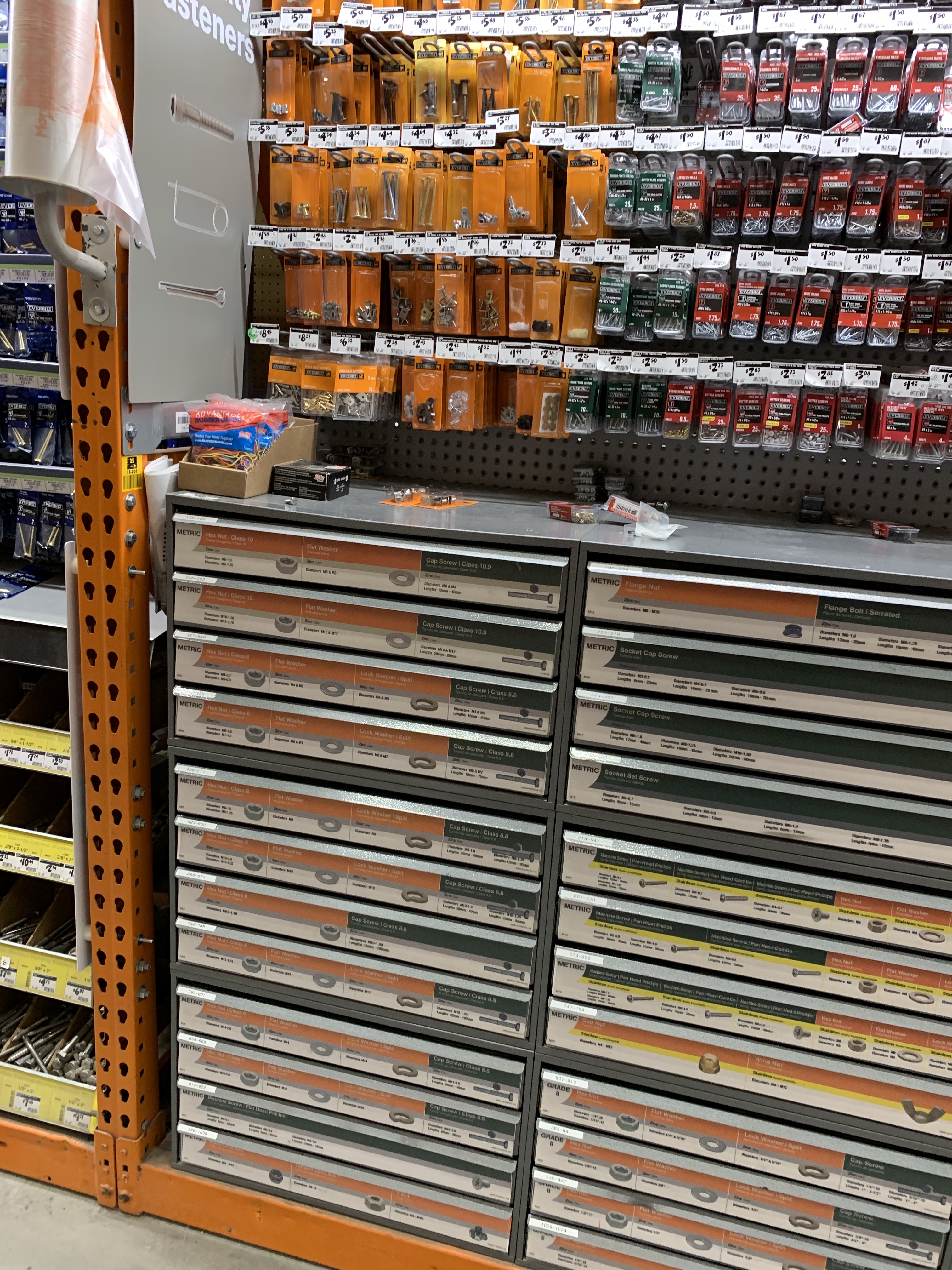 After a move we somehow lost one of the four exterior feet. The center feet are simple, they don’t have a locking nut. We took a center bolt-foot and moved it to the exterior. Then we went to Home Depot to find the right part.