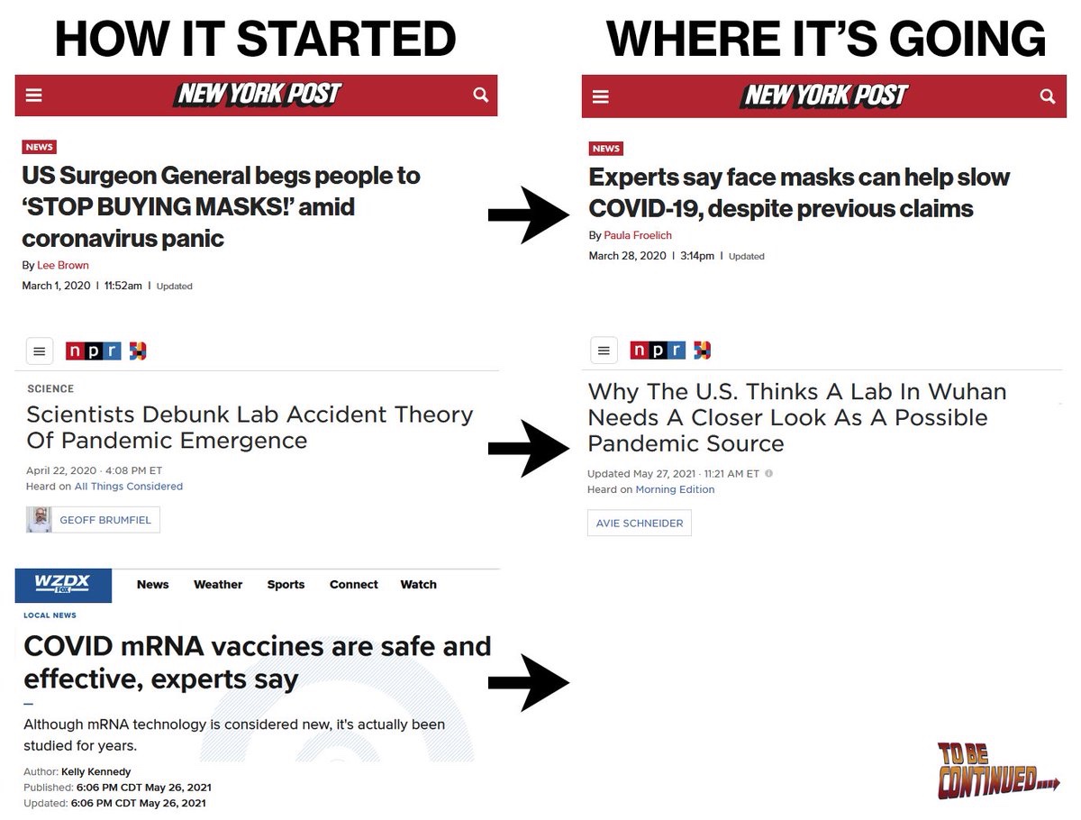 - In May of 2021, a topic that was forbidden to discuss and the focus of ‘conspiracy theorists’ was reversed – regarding the ‘lab leak’ hypothesis about the origin of the virus.