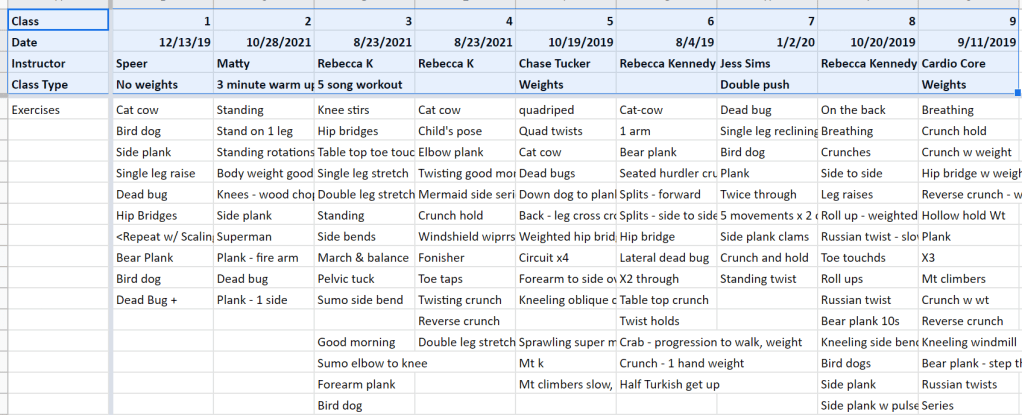 - Here’s a link to all the exercises in these nine classes (Google Sheet), an image is listed below