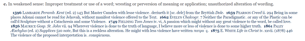 Violence: “Improper treatment or use of a word; wresting or perversion of meaning or application; unauthorized alteration of wording.”